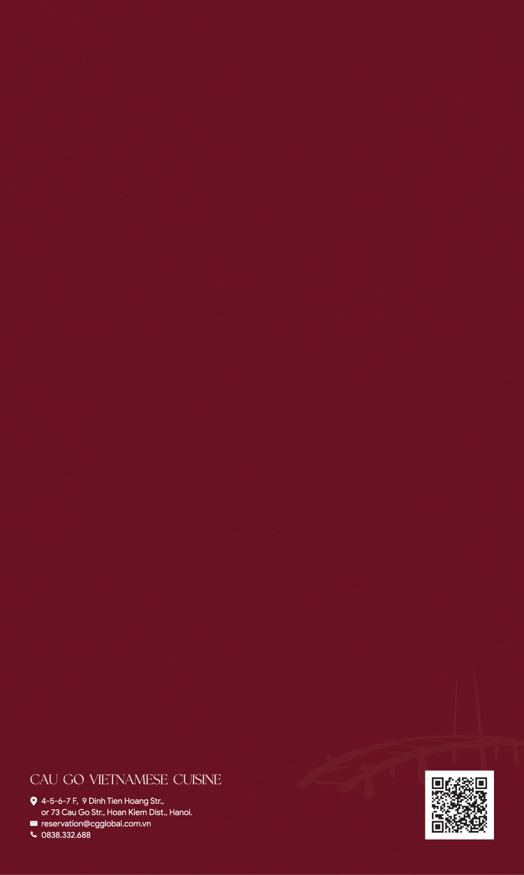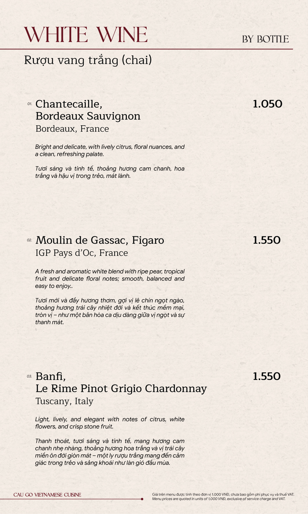 Cau Go Restaurant is pleased to present a thoughtfully curated wine list, featuring distinctive selections from renowned wine regions around the world. Each bottle is chosen to complement the flavors of Vietnamese cuisine, creating a refined and harmonious dining experience.